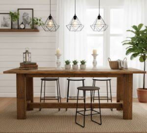 The dining table is the soul of a farmhouse home. Choose a large, solid-wood table — ideally with a natural or distressed finish. A plank-style or trestle table works beautifully.
