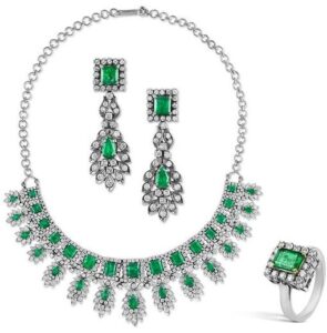 The strength of this suite lies in its harmony. The emeralds display rich colour, while the diamonds add brightness without overpowering the green tones.