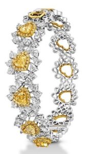 Executed in luminous 18k white gold, this rare diamond bracelet presents an elegant interplay of floral and heart motifs. The design feels romantic without being overly ornate. At its centre are fancy yellow diamonds, prized for their vivid saturation and scarcity.