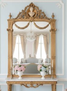 Mirrors with ornate classical frames are quintessential in Neoclassical interiors. Frames often feature laurel wreaths, columns, or pediments, echoing ancient architectural forms. Beyond their decorative role, mirrors were used to enhance light and create a sense of grandeur in formal rooms.