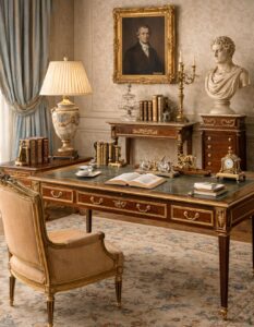 Neoclassical desks and consoles combine elegance with practicality. Writing desks often include fine drawers and restrained brass hardware, while console tables are designed to sit against walls, emphasizing symmetry. Dressers from this period showcase precise joinery and subtle decorative panels, balancing beauty with storage.