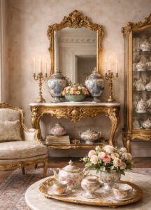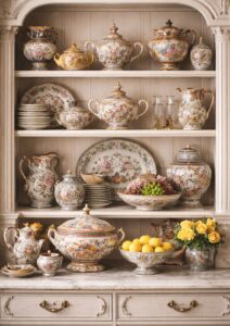 These pieces are no longer hidden behind glass cabinets. They’re styled openly on shelves, sideboards, and even kitchen counters. The soft blues, creams, and intricate patterns add a sense of calm and craftsmanship that contrasts beautifully with contemporary finishes
