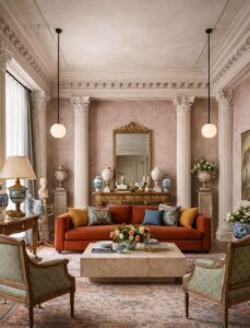 Expect to see architectural references like columns, fluted details, plaster finishes, and symmetrical layouts paired with modern lighting and clean-lined furniture. Antique neoclassical pieces work especially well here, grounding the look and preventing it from feeling overly theatrical.