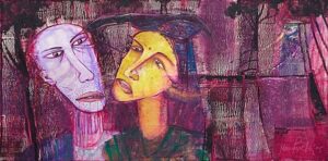 The painting centres on two elongated faces, a man and a woman. The surrounding landscape is not descriptive but symbolic. This painting reflects Parekh’s long-standing engagement with themes of human relationships, alienation, and inner conflict.