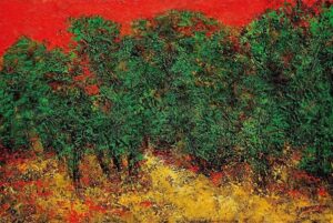The painting is dominated by a dense band of green forms that read as trees or foliage, pressed tightly together across the canvas. The red sky is bold and uncompromising, heightening the emotional charge of the scene. At the Giftex auction, this artwork attracted attention for its intensity and confidence of execution.