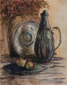 The composition is simple at first glance. A metal jug with a curved handle stands beside a shallow plate and a dish of fruit. Behind them, a rounded vessel and a cluster of flowers fill the background. There is a sense of lived time in the painting, as if these things have been sitting together for years. At the recent Giftex auction, this work drew strong attention and achieved a high price, reflecting the growing appreciation for Ara’s contribution to modern Indian art.