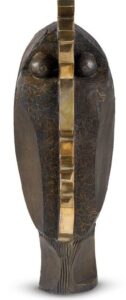 The form is vertical and compact, tapering slightly as it rises. A strong vertical band of polished metal runs down the centre, dividing the darker bronze body into two halves. At the Giftex auction, this sculpture stood out for its quiet authority and sculptural integrity. Collectors responded to its distilled form and strong material character.