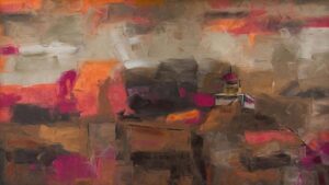 Adimoolam’s approach here is less about depicting a specific site and more about capturing the act of seeing itself. The “rock temple” seems to surface gradually from layers of paint, as if revealed through time, dust, and distance.