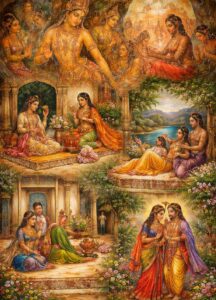 Spirituality is deeply embedded in Indian figurative painting. Figures are rarely just physical forms; they often represent philosophical ideas, divine principles, or moral states. Symbolic colours, gestures, and attributes transform the human body into a vessel of meaning.