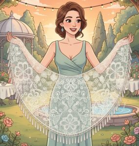 Rectangular shawls, square shawls, and crescent shawls work best. They sit smoothly over elegant outfits.