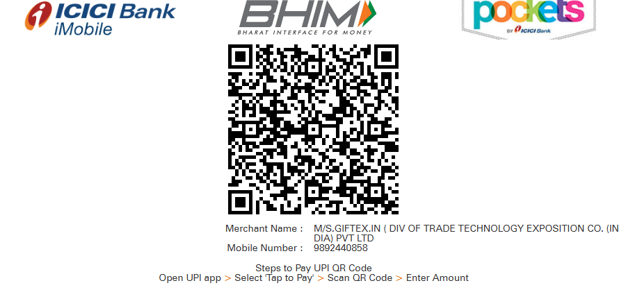 | Giftex Bank Details: Name of the Beneficiary: GIFTEX.IN (DIV OF TRADE & TECHNOLOGY EXPOSITION CO INDIA PRIVATE LTD) Bank Name: ICICI Bank, Branch: 240 Navsari Building, D. N. Road, Fort, Mumbai - 400001. India. Account No: 623505394545 Swift Code: ICICINBBCTS RTGS / NEFT/ IFSC Code: ICIC0006235 ![]() |